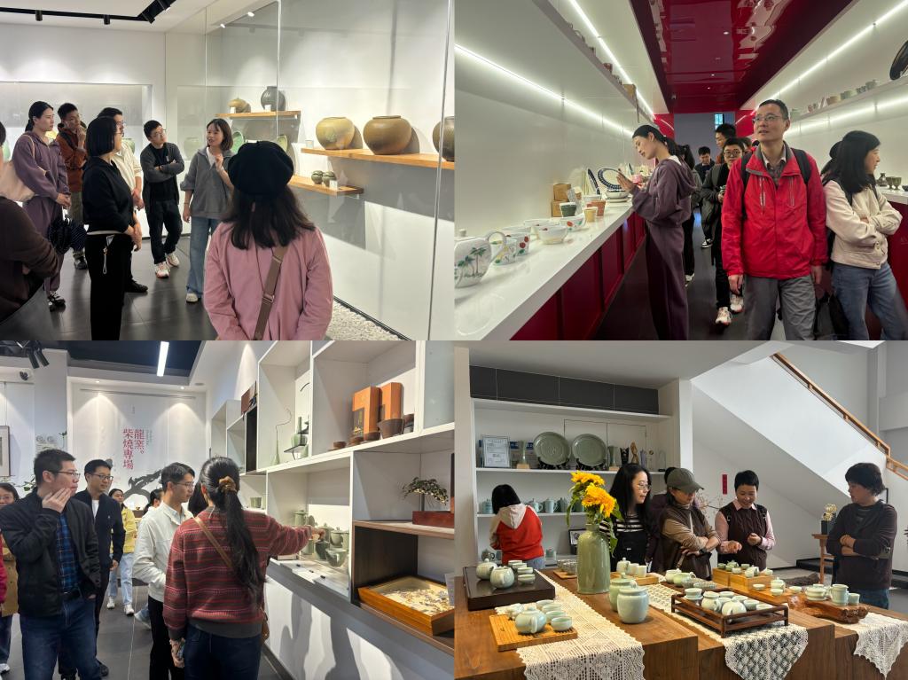 意犹未尽之际,一行人从湖畔的古意中转身,步入了充满现代气息的瓷艺作品展览厅。展厅内的作品令人耳目一新,与湖边的古老碎片形成了跨越时空的对话。那些基于传统青瓷技艺,又融入了当代美学与创意灵思的器物——无论是玲珑剔透的茶具,还是造型别致的艺术摆件——都吸引了老师们的浓厚兴趣。大家纷纷驻足于一件件精美的展品前,细细观赏其釉色、品评其造型,探讨着传统工艺在新时代的无限可能。展厅内的热烈交流与方才湖畔的静默沉思相映成趣,共同构成了青瓷文化从古老传承走向现代创新的完整图景。