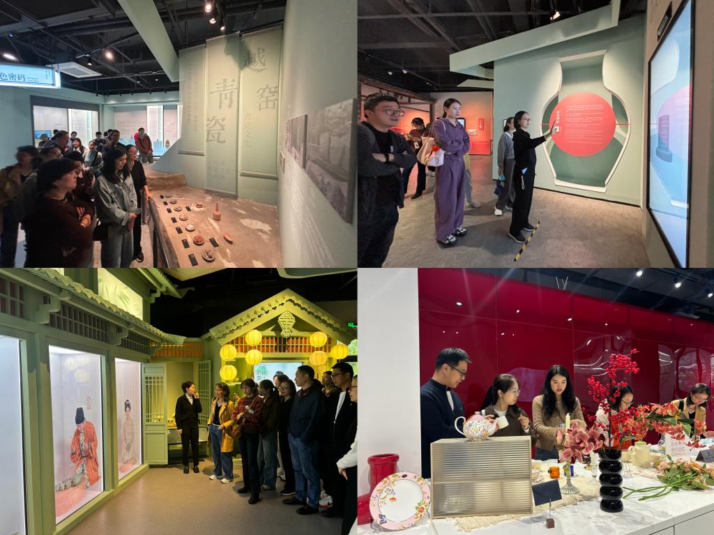 活动首站是参观上林湖越窑博物馆。步入馆内,仿佛穿越了时空长廊。在讲解员的细致引导下,老师们深入了解了越窑青瓷自东汉发端、历经三国两晋南北朝发展、至唐宋鼎盛的辉煌历程。而现代科技的融入,更让这段沉睡的历史变得可触可感、生动鲜活。面对一件件古朴典雅、釉色莹润的珍贵文物,大家不仅驻足凝视,还饶有兴致地通过体感互动装置,“模拟”完成瓷器的拉坯与刻花,在虚实之间体会匠心之不易;当全息投影电子屏上,乐师用复原的青瓷乐器奏出空灵清越的乐曲时,千年古音翩然而至,视觉与听觉的完美交融,令“九秋风露越窑开,夺得千峰翠色来”的意境有了更为直观和深刻的感悟。这场穿越古今的对话,让老师们在感叹古代工匠超凡智慧与技艺的同时,也深深钦佩于当代博物馆运用科技让传统艺术焕发新生机的巧思。通过对古老制作工艺流程的沉浸式学习,大家对泥与火交织出的艺术传奇肃然起敬。