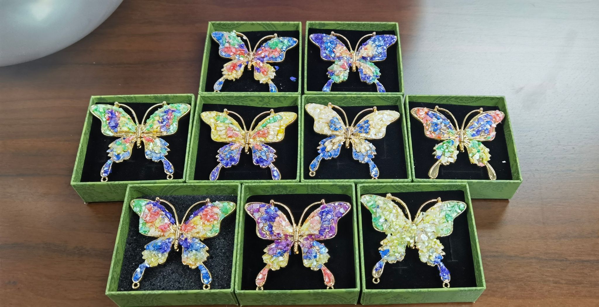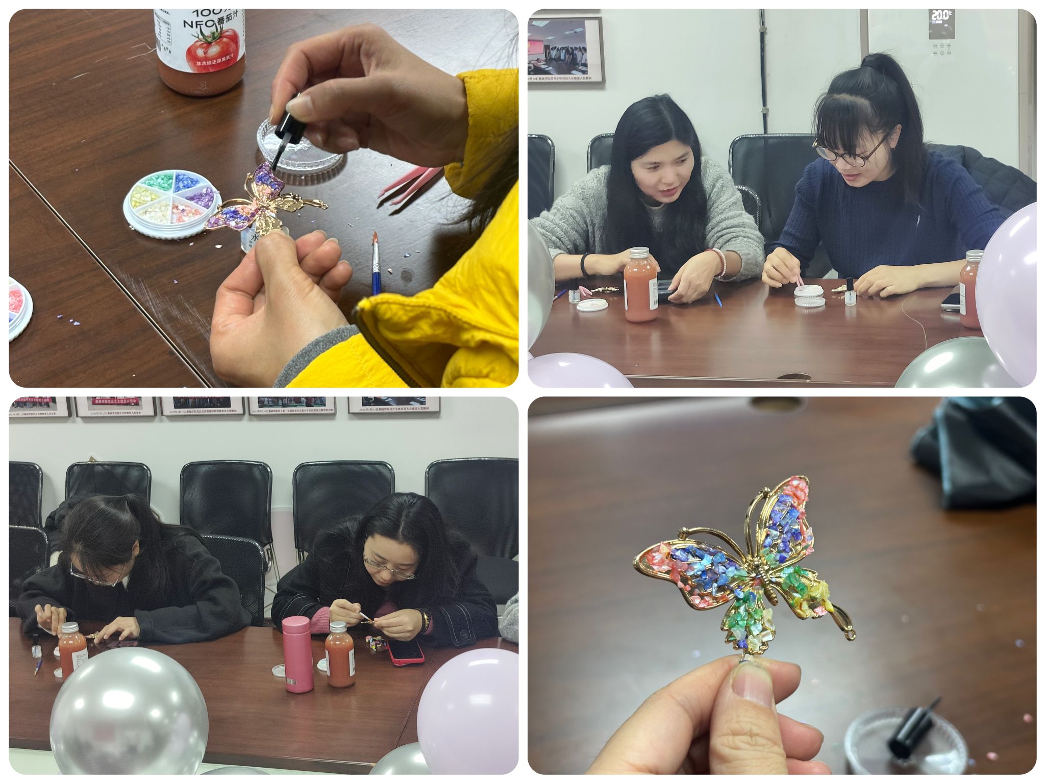 随着时间的推移,一件件流光溢彩、独一无二的蝴蝶胸针作品陆续诞生。有的作品色彩明丽,如春日繁花;有的素雅沉静,似水墨丹青;有的则巧妙运用螺钿的自然纹理,勾勒出蝴蝶翅膀的曼妙轮廓。每一枚胸针都凝聚着创作者的巧思与心血,闪耀着独属于女性的细腻与美感。看着自己亲手制作的作品,大家的喜悦之情溢于言表,纷纷与作品合影留念,记录下这美好的瞬间。